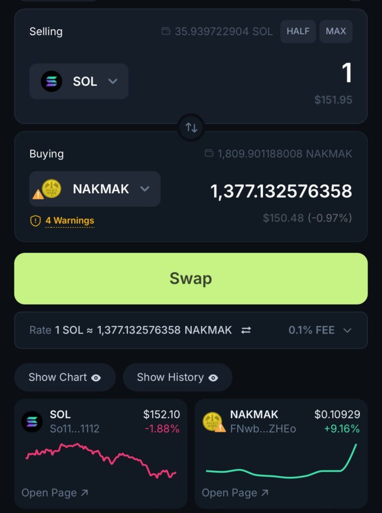 Auch der Tausch von SOL in NAKMAK direkt in der Phantom Wallet ist möglich.